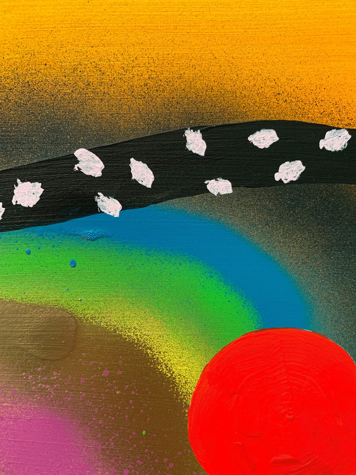 Spray acrylic, acrylic paint and gold sprays on mixed media paper.
