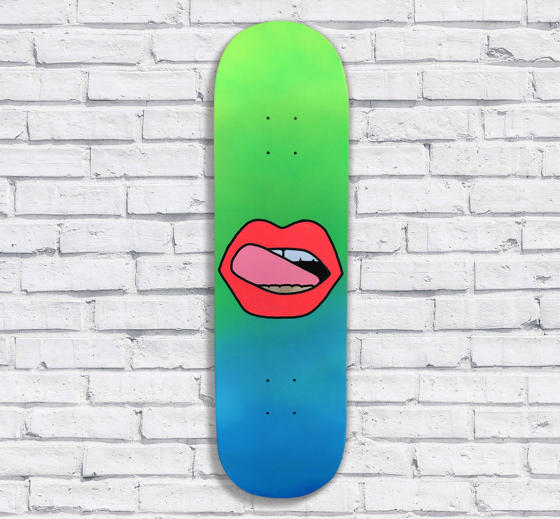 Spray acrylic, acrylic and gold leaf on a Canadian maple skate deck.